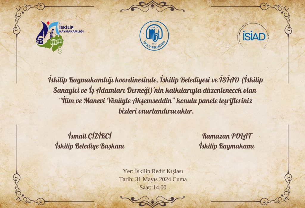 İlim ve Manevi Yönüyle Akşemseddin Paneli’ne tüm halkımız davetlidir!
